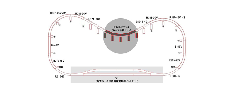 ・曲線半径はR481mmで設定。保線通路(手すり)はカーブの外側に配置。