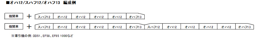 ●12系客車是於昭和44年(1969年)至昭和53年(1978年)之間製造的急行型座席客車,對應最高速度可達110km/h。車輛搭載由底部柴油發電機供電的冷氣設備,配備等同於當時電聯車或柴聯車的先進設施,成為後來14系等新型客車的基礎。