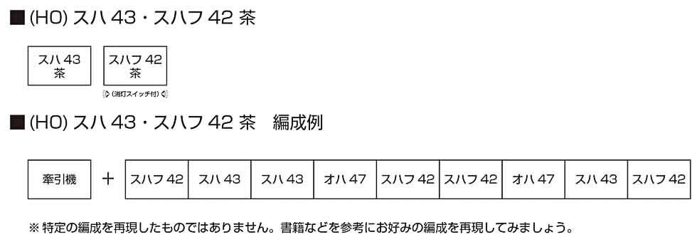 ● スハ43系 是日本國鐵代表性的客車之一,總產量超過 1,000 輛。由於長年生產,該系列衍生出多種不同形態,並透過不同的塗裝與改造產生豐富的變化。其活躍範圍遍及全國各條路線,無論是急行列車或普通列車,都能見到它的身影。即便在 JR 移行後,仍作為活動用車輛繼續運行。
