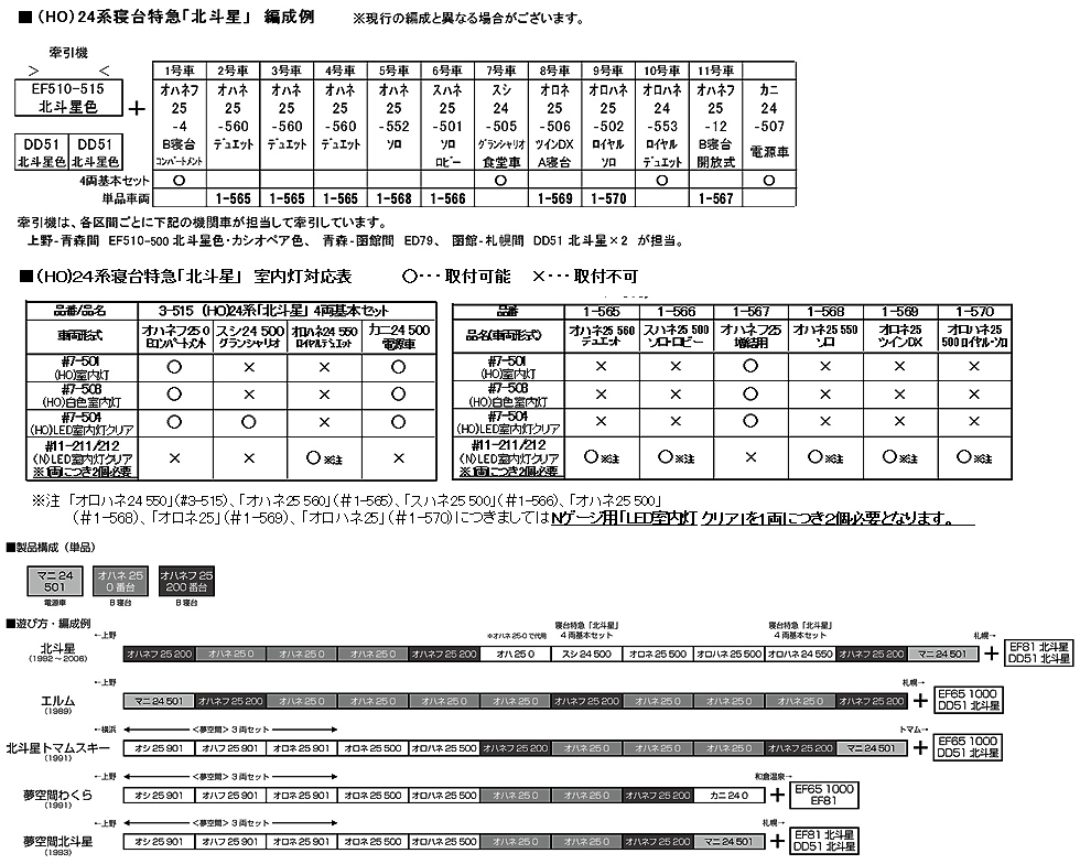・付属品・・・連結面用ダンパー、交換用方向幕パーツ(無地)、号車番号シール、密自連カプラー(前面用)、側面行先表示シール、列車無線アンテナ、消灯スイッチ用ドライバー、前面ホロ、交換用トレインマーク