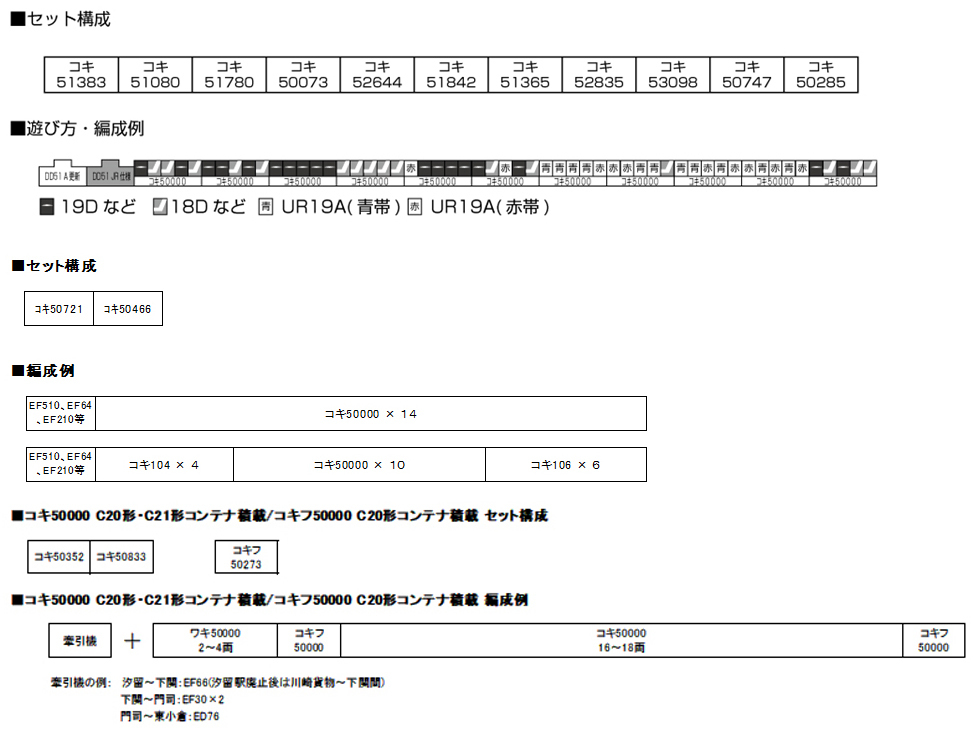 12ftコンテナを5個・20ftコンテナを3個積載可能な汎用コンテナ貨車で、JR移行後も後継のコキ100系列に置き換えられるまで主力として活躍していました。換装され、識別のためにグレーに塗られた台車がJR化後のコキ50000形式の特徴です。