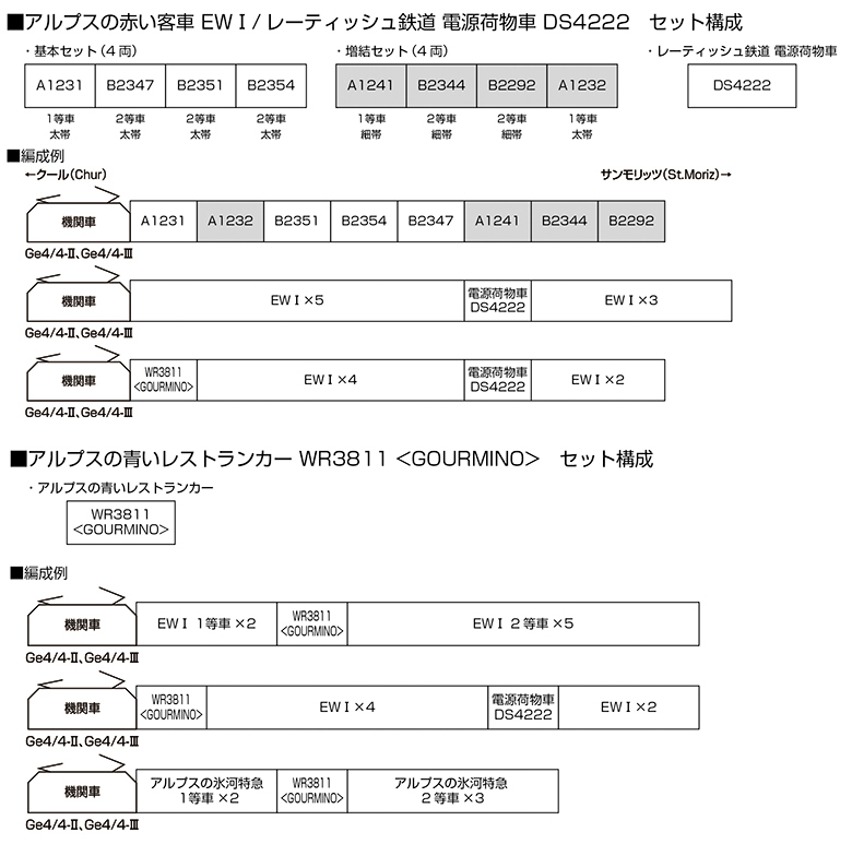 ●WR3811是為因應雷提施鐵道開始提供餐車服務而製造的車輛,配備了廚房與餐廳空間。原本為紅色車身,在經歷多次更新後,於1990年代末為配合「阿爾卑斯經典普爾曼快車(ACPE)」而改為深藍色塗裝。現今常見於冰河特快列車編組中,也可見於EWⅠ編成內服役。