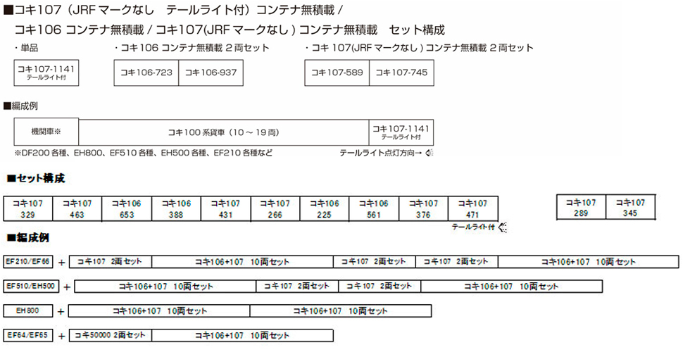 コキ107はコキ106を改良した汎用コンテナ車として落成し、ブレーキ装置をコキ200と同様のユニットブレーキ方式に変更し、手ブレーキがデッキ手スリにあることが特徴です。台枠はコキ106と同じグレーの塗装色をまとっています。