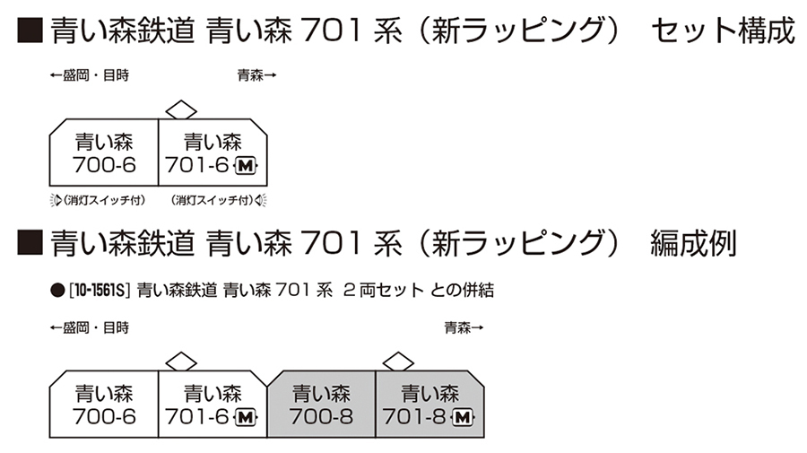 ◆N規模型版「青い森鐵道 青い森701系」新彩繪編組即將登場。同時計劃再版的 <10-1561S 青い森鐵道 青い森701系> 可搭配使用,還原過渡時期不同彩繪編組併結的臨時列車等場景,讓您享受青い森鐵道當前的風貌。