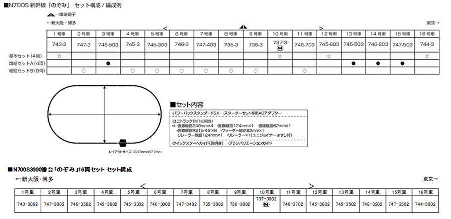 ◆此次產品起,動力裝置採用了無槽馬達(Slotted-less Motor)。另N700S 新幹線「希望號」JR東海所屬編成,除了推出實惠易入手的基本組(4輛)、增結組A(4輛)、增結組B(8輛)等套裝組合外,亦另有提供入門套組供選購。