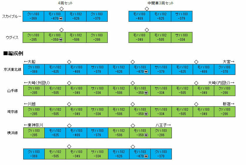 ●第一彈推出 103 系高運轉台型的 〈天藍色〉與 〈黃綠色〉 兩種塗裝;第二彈則推出 〈橘色〉、〈金絲雀黃〉、〈翡翠綠〉 三種塗裝。