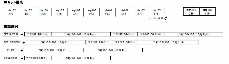・付属品・・・手ブレーキハンドル×10両分(コキ106+107(JRFマークなし) コンテナ無積載)。手ブレーキハンドル×2両分、反射板1両分(コキ107(JRFマークなし) コンテナ無積載)