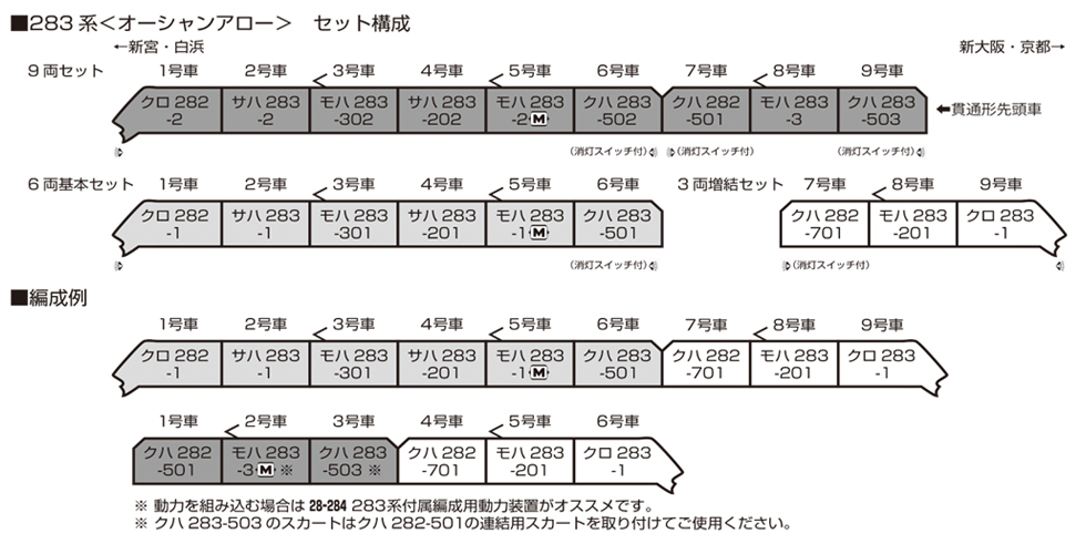 ・9両セット・・・消灯スイッチ用ドライバー、行先表示シール、電連(2段)×3両分、外観用スカート(クハ283-502/クハ282-501用)×各1両分