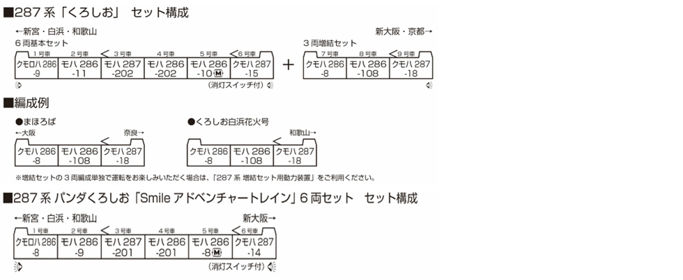 ・付属品…電連、行先表示シール:「京都」「新大阪」「和歌山」「白浜」「新宮」「奈良」、消灯スイッチ用ドライバー、「動物たちの紹介」リーフレット