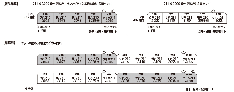 ●本次將製品化平成 18~25 年(2006~2013 年)期間活躍於房總地區的 211 系電聯車。該車輛源自高崎車輛中心的 211 系 3000 番台,在編成中加入綠色車廂、改為 10 輛固定編成時所騰出的車組,披上黃、藍相間的房總色,並隸屬於幕張車輛中心,用以取代部分 113 系車輛。