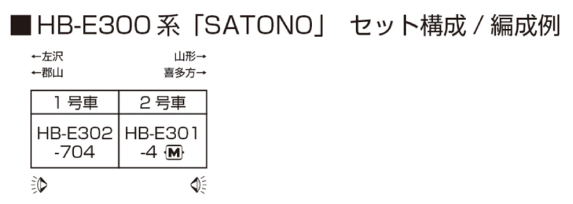 ●HB-E300系「SATONO」的1號車與2號車車身顏色不同。1號車以綠色系的色調,表現出東北地區綠意盎然的群山、稻田及農作物的豐收;2號車則以藍色系的色調,象徵東北地區清澈豐富的水源及透明潔淨的空氣。此列車自令和6年(2024年)4月開始運行,主要在福島縣與山形縣一帶活躍中。