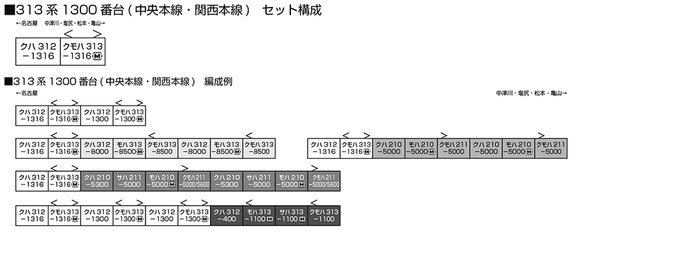 ●313系はJR東海の直流近郊形電車で、番台によって車内の座席配置、両数などが区分されています。転換クロスシートと車端部ロングシートの座席配置の1300番台は2両編成のワンマン対応車で、中央本線・関西本線で活躍しています。