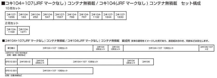 ◆此系列推出無 JRF 標誌、無「禁止衝放」與檢修標記的簡約外觀「コキ104」兩輛組合與搭配「コキ107」的十輛套裝。若與同期推出的〈3096-1 EF510 301〉或其他現行電力機車搭配,即可重現現代日本貨物列車的風貌。