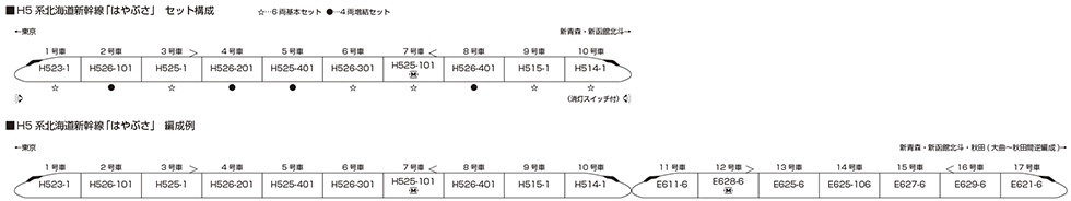 ●H5系基於JR東日本的E5系,並對內外裝進行了部分修改。外觀及塗色與E5系相似,但圍繞車身一圈的紫色條紋稱為「彩香紫」,側面還印有以北海道和白隼為主題的象徵標誌,該標誌出現在5節車廂上。平成29年(2017年),2、4、6、8號車的部分座位區改為大型行李存放區,並進行了封窗施工。之後,1、3、5、7號車也進行了同樣的改造,除了9、10號車,全車皆已設置行李存放區。
