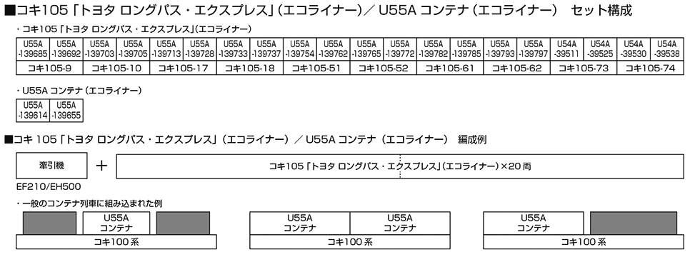 ●貨櫃車部分由全新製作的コキ105構成,為兩輛一組單元(偶數號車為共用奇數號車車體,部分結構與實車略有差異)。