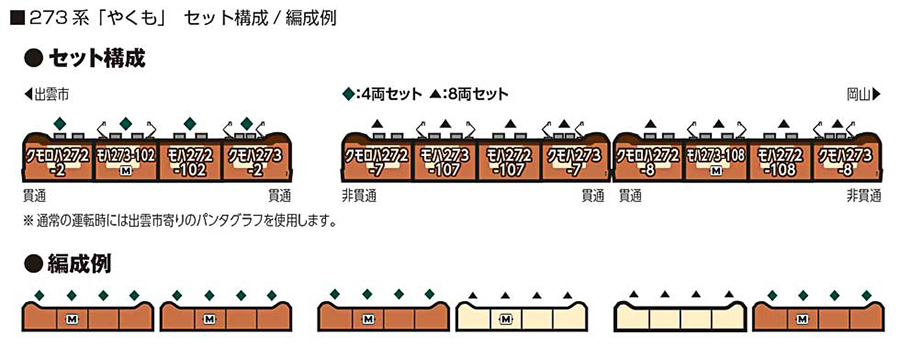 4輛基本組為雙端皆為貫通構造的編成;8輛特別企劃組合為一端(出雲市方向)為クモロハ272 非貫通構造、另一端(岡山方向)為クモハ273 非貫通構造的組合。