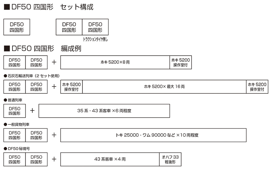 ●DF50 是為了非電化次幹線區間實現無煙化(即取消蒸汽機車),自昭和32年(1957年)起開始製造的柴油機車。其動力傳動方式採用了「電氣式」,即利用柴油引擎直接帶動發電機,再以直流電驅動主電動機行駛。