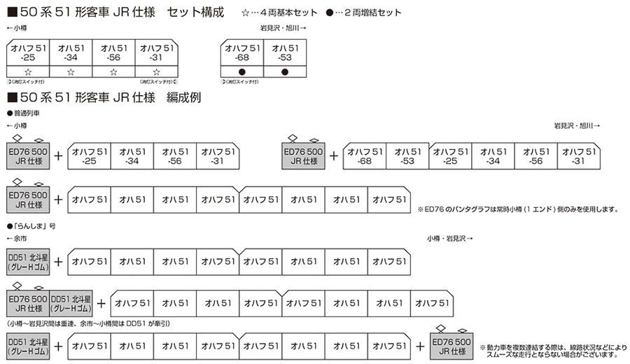 ●50系51形客車於昭和54年(1979年)作為北海道用的一般型客車登場。基於本州用的50系客車進行了雙層窗戶及車軸發電機安裝等耐寒、耐雪設備改造,並在北海道的主要幹線上運行。