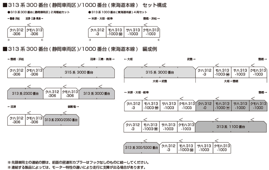 ◆KATO的313系系列陣容持續擴充,這次將東海地區的主力車型——300番台與1000番台商品化。300番台重現了與315系併結運行的當前樣貌,1000番台則重現了轉屬至大垣車輛區後的現行配置。兩者的共通特徵為:車體上省略了所屬標記。您可與同時預定發售的〈10-2065 315系3000番台 4輛組〉等產品搭配,享受重現東海地區近年鐵道風景的樂趣。