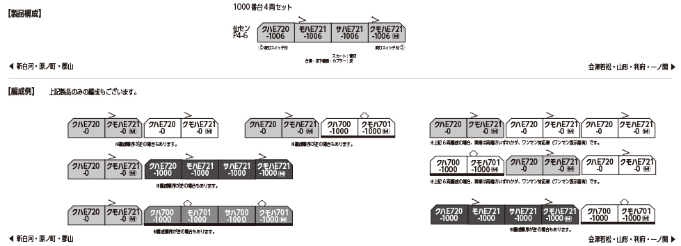 ●6 輛組:クハE720-7、クモハE721-1011:裝飾車勾+裝飾車勾蓋,クモハE721-7、クハE720-1011:連結用裙板+連結器蓋