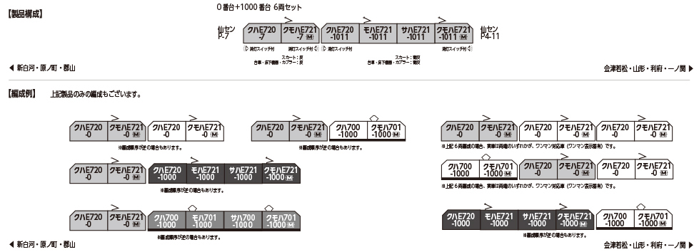 ●6 輛組:クハE720-7、クモハE721-1011:裝飾車勾+裝飾車勾蓋,クモハE721-7、クハE720-1011:連結用裙板+連結器蓋