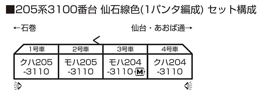 ●仙石線是東北地區唯一一條直流電化的JR線,經由仙台和松島海岸等地連接青葉路站和石巻站。2002年之後,部分205系中間車被改造成車頭,並在組成四節編組作爲3100番台從首都圈轉移到了仙台。其中包括搭載集電弓的部分未經改造的單集電弓編組和改造後的雙集電弓編組。