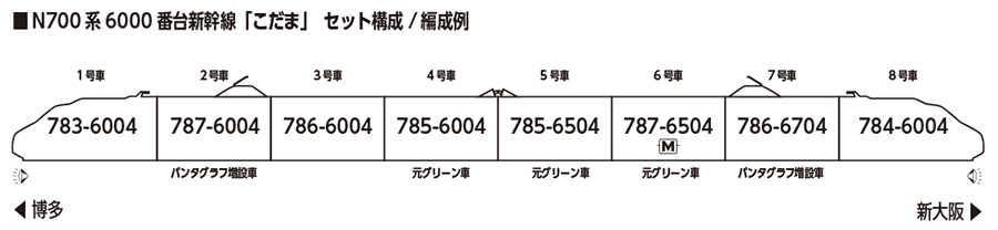 ●N700系6000番台於2025年9月登場,作為替換長期在山陽新幹線區間以「こだま」為主運行的500系與700系車輛之用。其由N700系5000番台(小A)自16節編成縮短為8節編成,並進行加裝集電弓(パンタグラフ)與部分車窗封閉等改造。塗裝延續白色車身搭配藍色帶的設計,原本的綠色車廂則在保留座位配置的情況下改為指定席車廂使用。