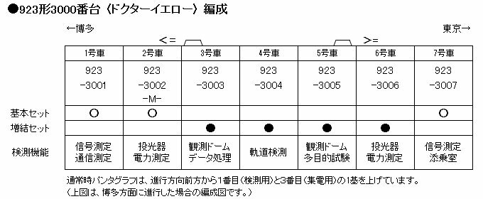 俗稱「Dr. Yellow」的 923型 3000番台 T5編組,是用於東海道・山陽新幹線的電氣軌道綜合試驗車,負責收集軌道維護所需的基礎數據。其獨特的黃色外觀使其深受新幹線迷、兒童及旅客的喜愛。
