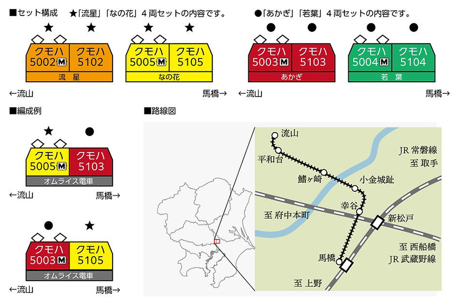 ●若與已發售的「流星」「菜之花」編成搭配,可再現話題十足的「蛋包飯電車(オムライス電車)」塗裝組合!
