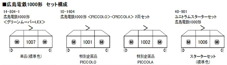 ●本次將標準塗裝的〈Green Mover LEX〉(深綠與淺綠配色)作為一般商品發售,並以最初製造的兩列車編號1001號「PICCOLO(皮可羅)」與1002號「PICCOLA(皮可拉)」推出特別企劃品套裝。這兩列車為紀念廣島電鐵通車100週年所打造,車身塗裝為具有特色的紀念紅色。