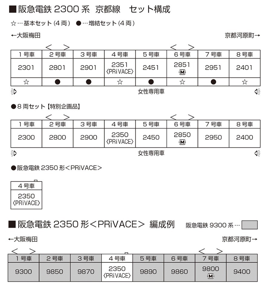 ・為方便搭配現有的阪急9300系產品,本體無印刷車號,附 對應9300系的車號轉寫貼紙(含幕板部車號)
