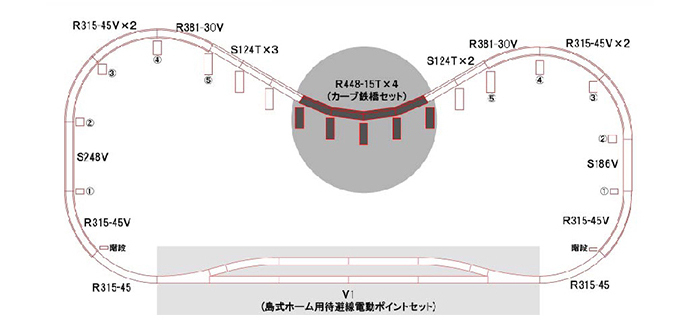 ・以伯備線名勝為靈感,裁切曲線鐵橋部分的套裝。包含:單線甲板樑曲線鐵橋 R481-15°(紅)4 根、單線鐵橋用圓錐台形橋墩 No.5 5 組、片聯接件 2 個。