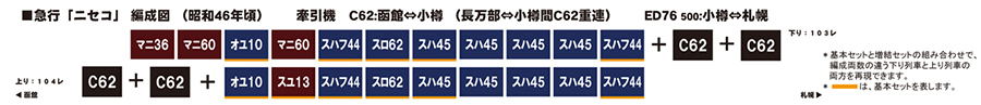 ◆代表昭和40年代後期蒸汽機關車熱潮的北海道C62 2號機與3號機,再度以模型形式登場。可重現著名的2號機+3號機牽引急行「ニセコ」的雙機重連運轉場景。