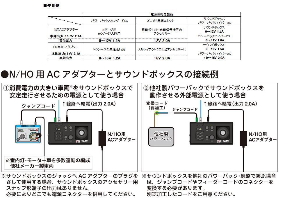 HO用ACアダプターを使用して最大出力での運転を行うと、車両製品を傷める恐れがあります(他社製品の電気的仕様や、速度超過による脱線など)ので、車両製品に添付の説明書きや仕様などをご確認になり、運転操作にも十分ご注意ください。