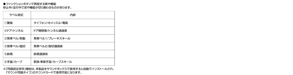 ・6つのファンクションボタンを押すことにより、ドアや警笛などの車両の普遍的なサウンドや、トンネルや踏切、鉄橋の通過といった音で鉄道の旅を演出します。