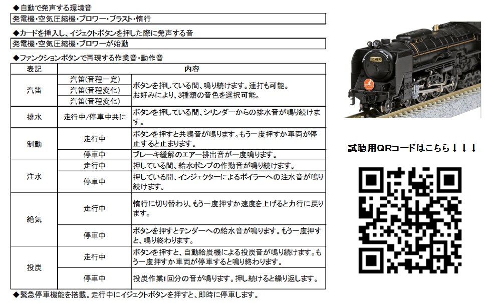 当社C62製品の走行とブラストサウンドの同期感や、実車C62の高速走行に欠かせない自動給炭機(メカニカルストーカー)の作動音をお楽しみください。発売中の#2017-6「C62 常磐形(ゆうづる牽引機) 」との組み合わせがおすすめめです。