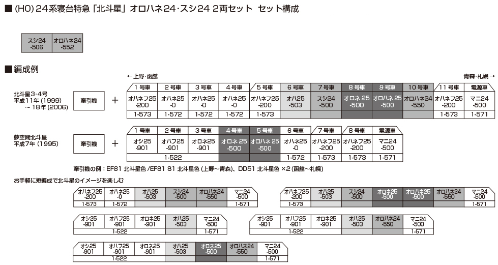 ●與既有產品〈3-515 24 系臥鋪特急「北斗星」4 輛基本組〉不同,車號為 スシ24 506 / オロハネ24 552。