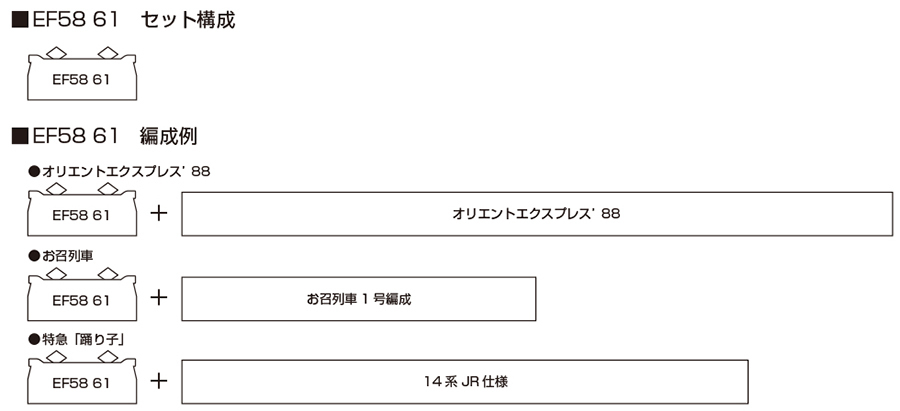 ●EF58 61號機車是在昭和28年(1953年)7月的訂購階段起,就被指定為御召列車專用機關車而誕生的車輛。車體塗裝為被稱作「溜色」的深紅色,並配有不鏽鋼裝飾帶,以及未塗裝並經拋光處理的下部結構,外觀極為華麗。