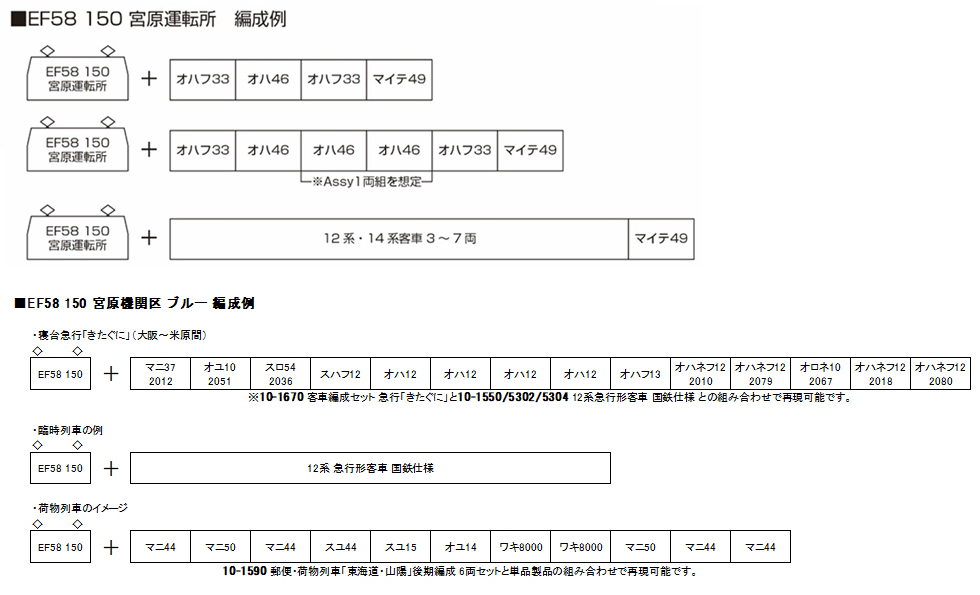 ●EF58 150號機於昭和33年(1958年)3月由東芝府中工廠製造,作為東海道本線至山陽本線電氣化延伸後,幹線特急列車的牽引機而活躍。以宮原機關區、宮原運轉所(現今的宮原綜合運轉所)為基地,長期服役。於平成23年(2011年)正式退役,現展示於京都鐵道博物館。