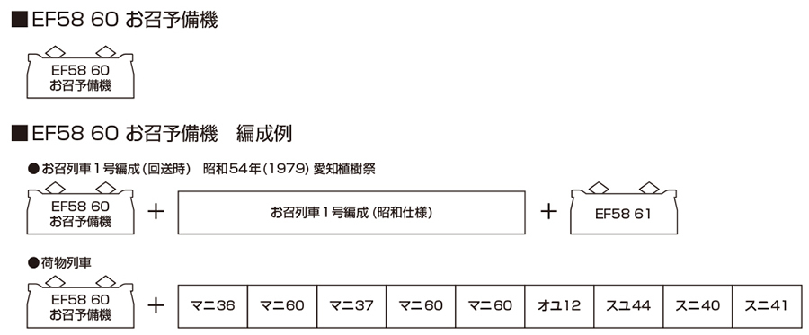 ◆本次將再生產曾作為御召備用機活躍的EF58 60號機。可與現正熱賣的〈3038 EF58 61〉以及預計同步再生產的〈10-853 御召列車1號編成(昭和規格)〉一同搭配享受。