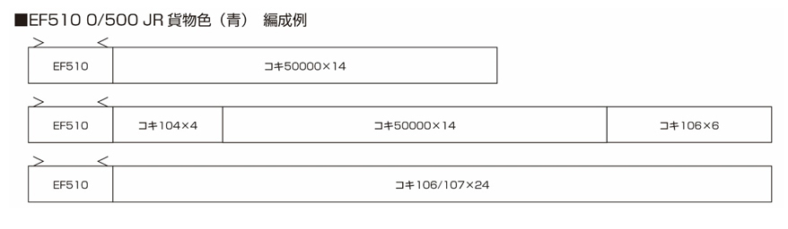 ●EF510 500 JR貨物色(藍)原為牽引臥鋪特急「北斗星」、「Cassiopeia」等列車的客運機車,轉籍至JR貨物後,移除了原有的流星裝飾,與0番台機車一同活躍於以日本海縱貫線為主的長編成貨物列車牽引任務中。