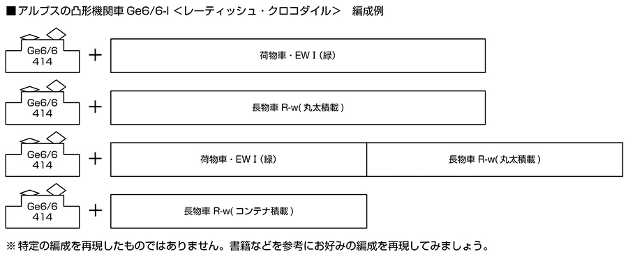 ●Ge6/6-I,通稱「雷塔恩鱷魚」(Rhaetian Crocodile),是隨著阿爾布拉線(Albula Line)電氣化而於1921年登場的連桿驅動式6軸凸型電氣機關車。