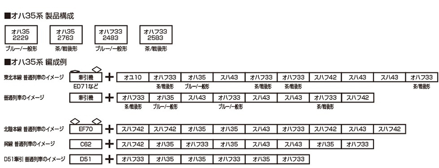 ●OHAFU 35系是戰前日本國鐵具有代表性的客車形式之一,量產超過 2,000 輛,是日本國內客車中保有數量最多的系列。於昭和 13 年(1938 年)以折妻式車體、圓形車頂、1 公尺寬的客室窗、TR23 型轉向架,以及大量採用焊接工法的結構登場。