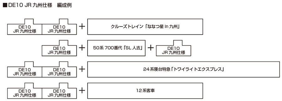 ◆將以黑色為主調塗裝為特徵的 DE10 JR 九州仕様再次生產。亦推薦作為預計同時發售的〈10-2168 豪華郵輪列車「九州七星(ななつ星 in 九州)」〉之牽引機使用。