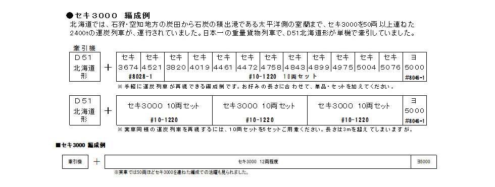 SEKI 3000型是主要活躍於北海道的煤炭專用漏斗車,用於從礦區到港口的煤炭運輸。其特色為車體側面標示65km/h限速的黃色條紋及“道外禁止”字樣。搭載D51蒸氣機車的2400噸長編煤炭列車,從夕張、芦別等礦區駛往小樽、室蘭等港口,成為當時貨運的重要一環,並深受鐵道迷喜愛。特別是在室蘭本線上,D51單機牽引全國最重貨運列車的景象尤為壯觀。