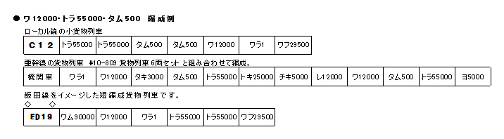 ●ワ12000此型車輛為10噸載重,相較於標準的15噸級ワム80000等車輛,其載重量僅約三分之二,但因應小型貨主需求,自昭和31年起於國鐵工廠生產共500輛。