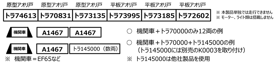 ●トラ70000型為了取代老舊的長尺兩軸無蓋車,於 1967 年至 1969 年之間製造,是一種泛用型無蓋貨車。