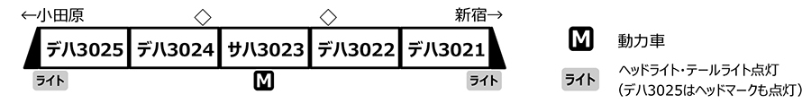 ●使用附贈聯結零件,可重現收藏於浪漫特快博物館後的3輛編成;此時,中間車的底盤設備以及デハ3021、デハ3022的冷氣顏色(實車在縮編為3輛時塗為黑色)會有所不同。