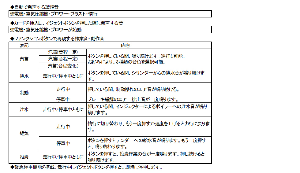 ●6つのファンクションボタンを押すことで、汽笛や投炭など機関士や機関助士による作業や機器から発する音が鳴動します