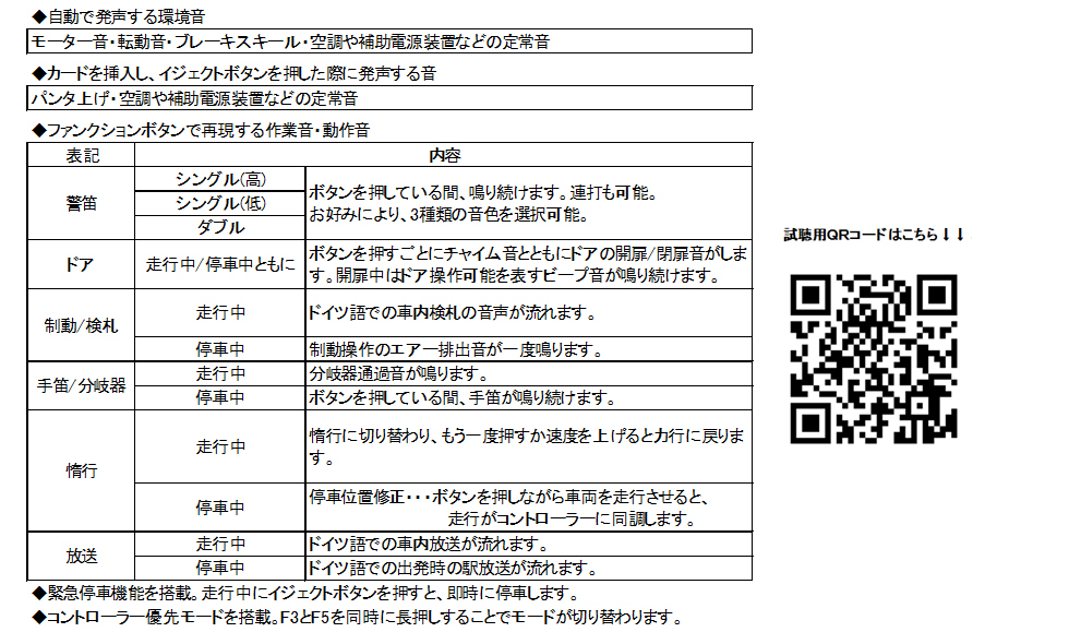 ●駅放送の鐘の音とドイツ語のアナウンス、手笛に続く警笛、駅構内に連なる分岐器の通過音などを再現。ファンクションボタンの組み合わせで、発車→高速走行→到着までの一連のストーリーをお楽しみいただけます